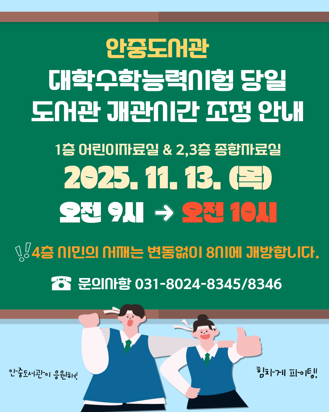 ![]() 2026학년도 대학수학능력시험 당일(11.13.목) 안중도서관 1층 어린이 자료실 & 2,3층 종합자료실 개관시간이 오전 9시 → 10시로 변경되어 운영합니다. ※ 4층 시민의 서재는 변동없이 오전 8시 개방합니다. 이용에 참고해 주시기 바랍니다. |