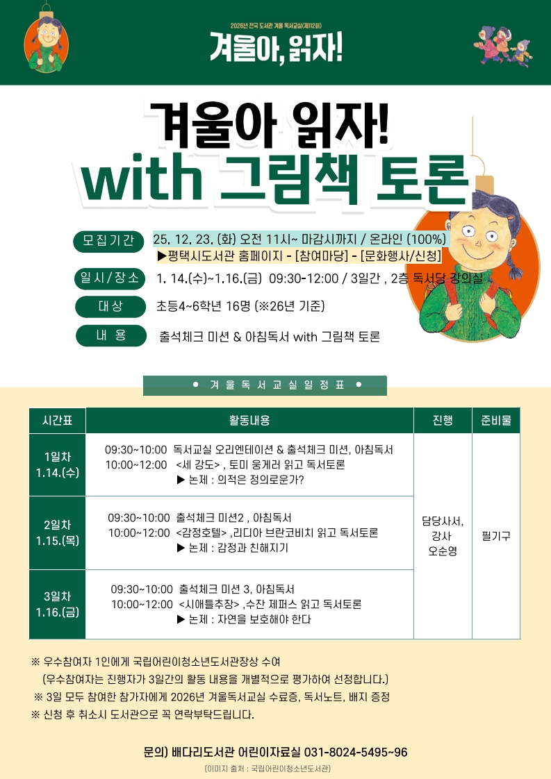 [2026] 평택시도서관 겨울방학 독서교실 안내