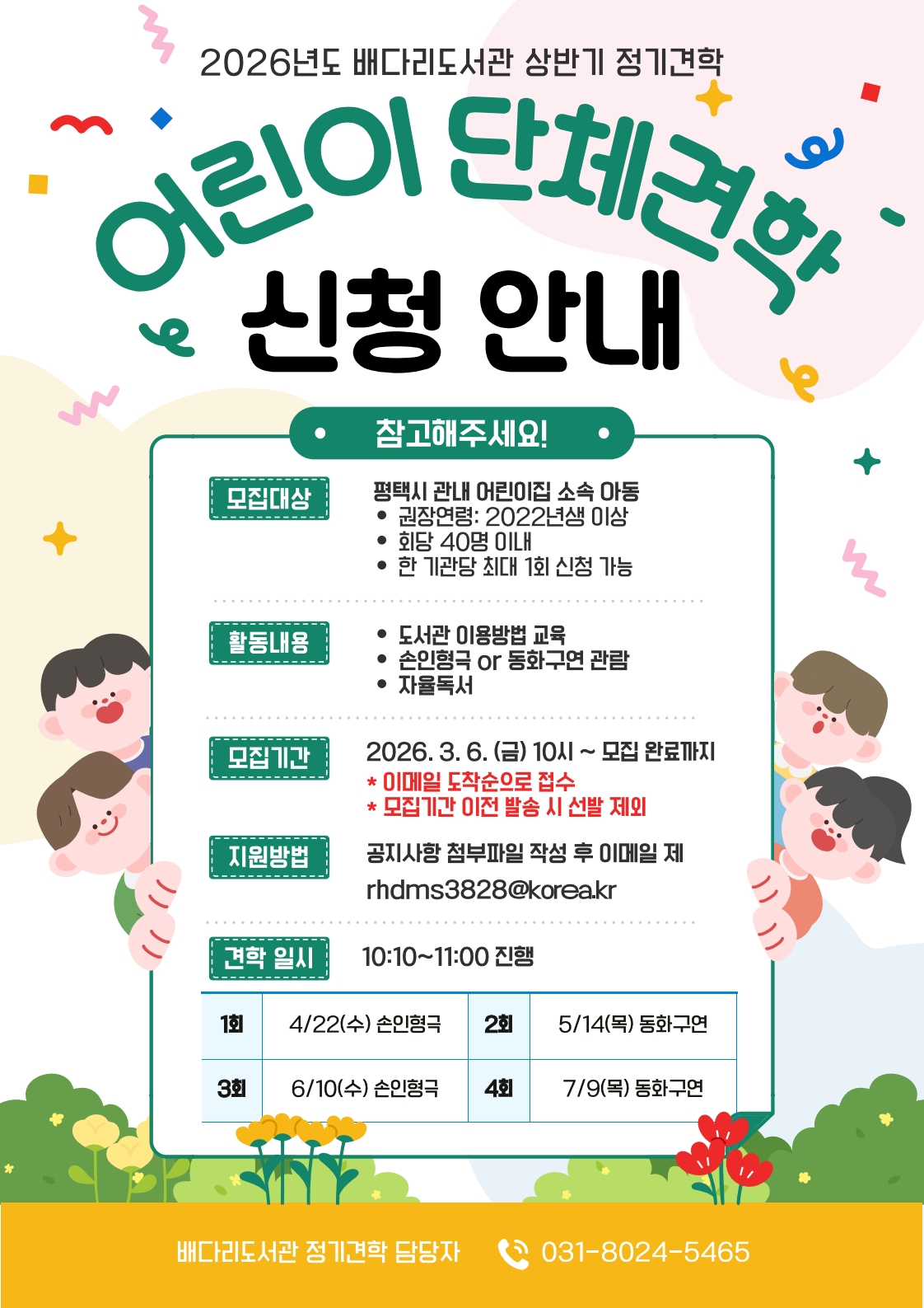 ![]() ❍ 일 시 : 4.22.(수) ~ 7.9.(목) / 4회차 ❍ 대 상 : 평택시 관내 기관(어린이집 및 유치원) ※ 회당 40명 이내 / 한 기관 최대 1회차 접수 가능 ❍ 장 소 : 배다리도서관 시청각실, 어린이 자료실 ❍ 접수기간 : 3.6.(금) 오전10시 ~ 정원 모집 완료 시(선착순) ❍ 접수방법 : 첨부파일의 신청서를 담당자 이메일로(rhdms3828@korea.kr) 제출 ※이메일 도착순으로 접수, 접수기간 이전 발송시 선발 제외 (신청서에 기재된 연락처로 접수결과 알림 예정) ❍ 문의전화 : 배다리도서관 견학진행 담당자 (031-8024-5465) |
