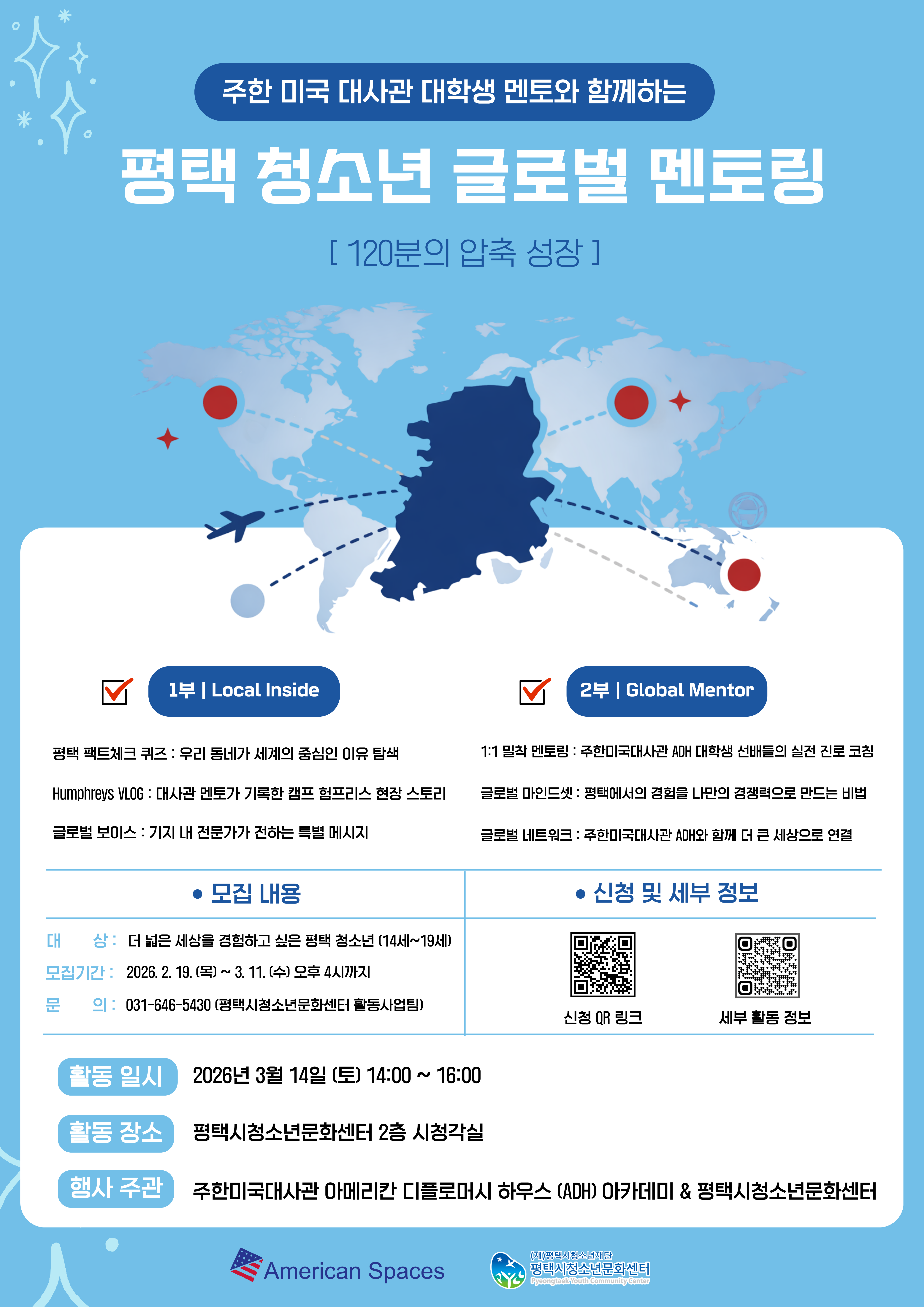 주한 미국 대사관 아메리칸 디플로머시하우스에서 주최하는 평택 청소년 글로벌 멘토링 프로그램에 관심이 있으신 분들은 아래 홍보문 내 QR링크 이용하여 신청해 주시길 바랍니다.