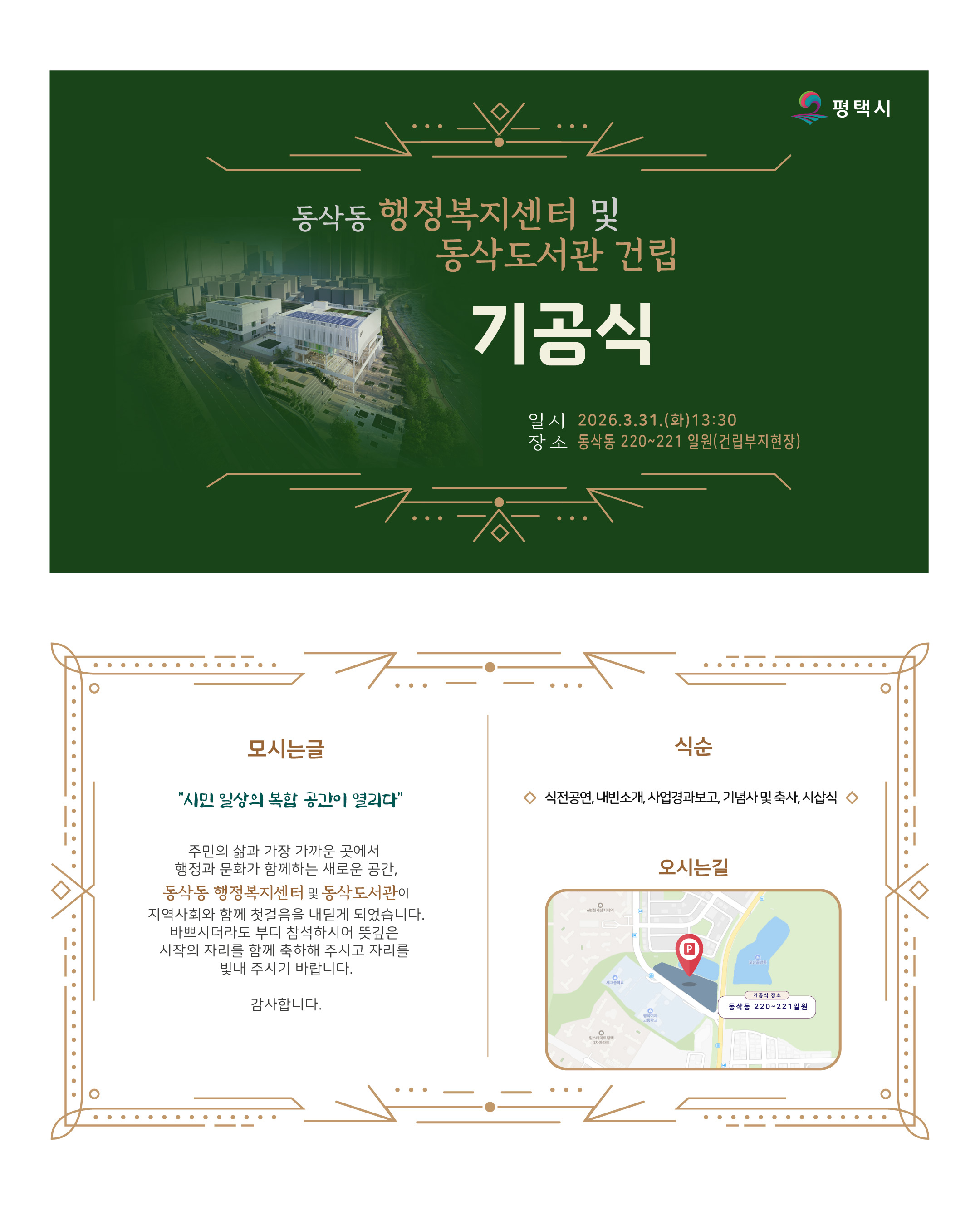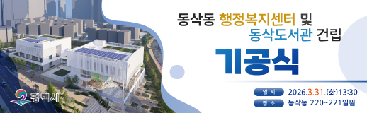 <동삭동 행정복지센터 및 동삭도서관 건립> 기공식에 시민여러분을 초대합니다.! *일시: 2026년 3월 31일(화) 오후 1시 30분(*식전공연: 오후 1시 20분~1시 30분) *장소: 동삭동 221-221 일원 *대상: '동삭도서관 건립'에 관심있는 시민 누구나 ![]() ![]() *당일 주차 혼잡이 예상되오니, 가급적 도보 및 대중교통 이용바랍니다 많은 참여 바랍니다. |