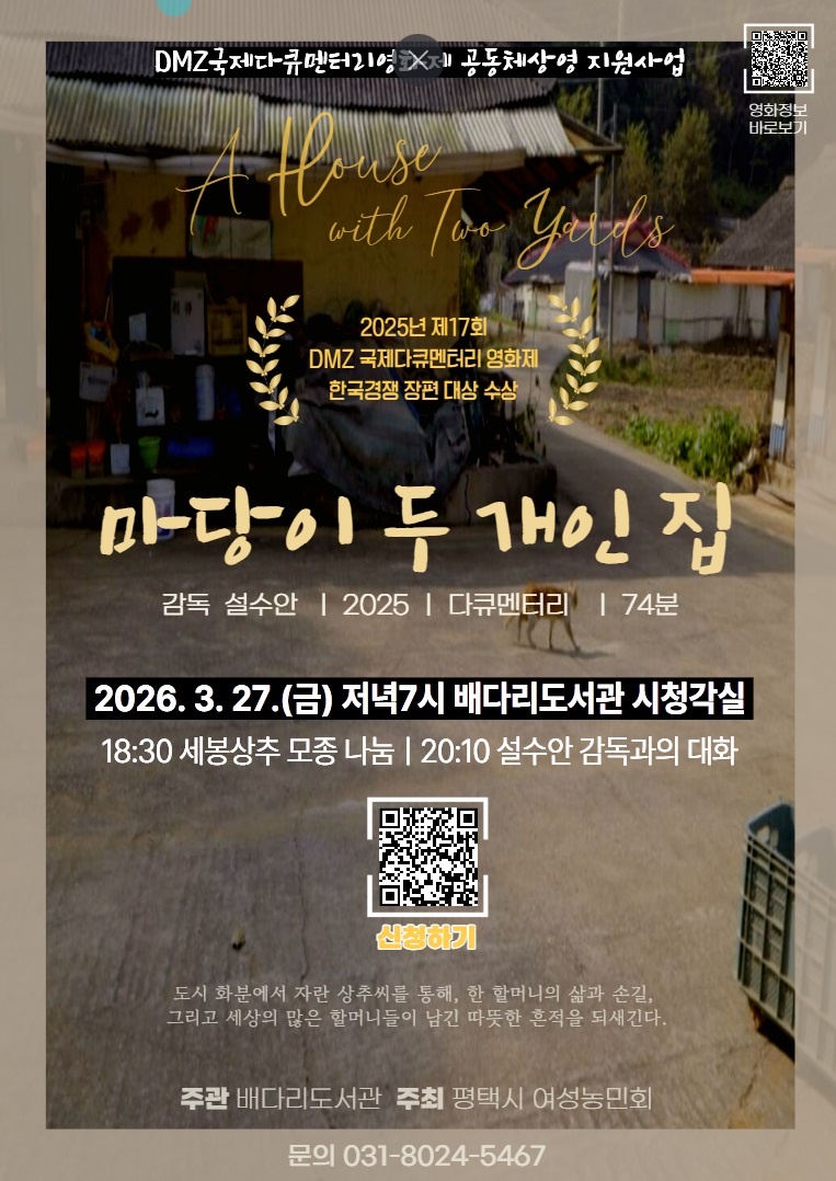 2026. 3. 27.(금) 저녁 7시 배다리도서관 시청각실에서 특별한 시간을 준비합니다~! 2025년 제17회 DMZ 국제다큐멘터리 영화제 한국경쟁 장편 대상을 수상한 설수안 감독의 <마당이 두 개인 집> 영화 상영과 감독과의 대화!!! 영화상영 전 "세봉상추 모종 나눔"도 함께 하오니 많은 관심 부탁드립니다. >>신청하기<< >>네이버폼으로 신청하기<< !!!!홈페이지 접속이 안될때는 네이버폼을 이용해주세요~