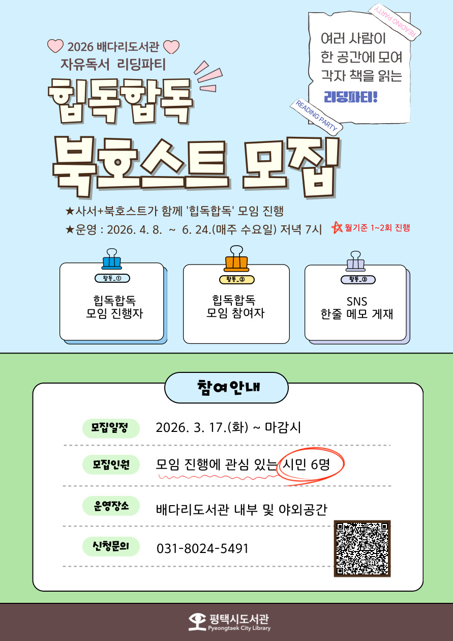 2026년 자유독서프로그램 <힙독합독> 북호스트* 모집 √신청하기 클릭 >>>>> 프로그램참여신청 : 배다리도서관 *북호스트란? 시민 참가자들이 <힙독합독> 자유독서프로그램에 참여할 수 있도록 리딩파티 모임을 운영하는 안내자 및 진행자 ○운영기간: 26. 4. 8. ~ 6. 24.(매주 수요일) 저녁 7시 ※ 월기준 1~2회 진행 ○접수기간: 26. 3. 17.(화) ~ 마감시 ★온라인만 접수 ○모집인원: 자유독서 모임 진행에 관심 있는 시민 6명 ○활동내용 : 힙독합독 모임 진행 및 참여 ![]() |