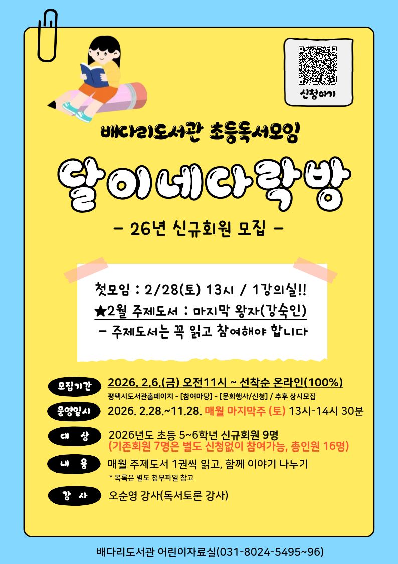| [2026년 초등독서모임] 달이네 다락방 신규회원 모집 ★기존 참여자는 별도 신청 없이 참여가능!! ※ 접수기간 : 2026.2.6.(금) 오전 11시~ 선착순 / 온라인 100% ![]() |