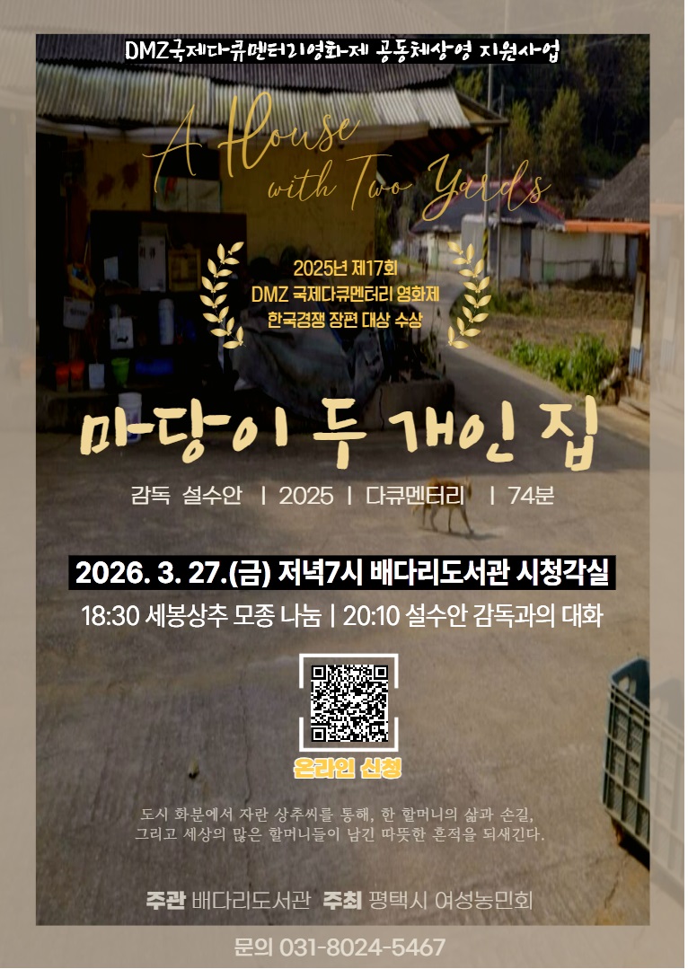 ㅇ 18:30 세봉상추 모종을 선착순으로 나눠드립니다.(조기소진 될 수 있습니다!~) ㅇ 19:00 영화 <마당이 두 개인 집> 상영 / 약 74분 ㅇ 20:10 영화상영 후 설수안 감독님과 대화의 시간이 마련되어 있습니다. ![]() |