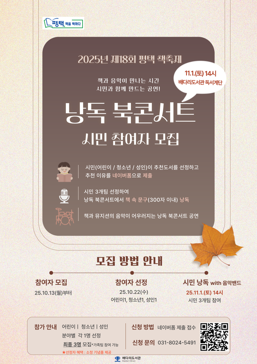 2025년 제18회 평택 책축제 낭독 북콘서트 <시민 참여자> 모집 안내(★기 제출자 추가 작성 요청) □ 프로그램 내용: 책과 음악이 만나는 시간, 시민과 함께 만드는 공연 □ 모집일시: 2025.10.13.(월)~ □ 모집대상: 총 3명(어린이 1명, 청소년 1명, 성인 1명) ※ 기 제출자 추가작성 필요 또는 담당자(031-8024-5491) 연락 □ 신청방법: 네이버폼 제출 접수 □ 참여자 선정 : 개별 연락 □ 운영방법 ① 시민이 추천도서를 선정하고 추천 이유를 네이버폼으로 제출 ② 시민 3개팀 선정하여 낭독 북콘서트에서 책 속 문구(300자 이내) 낭독 ③ 연주팀은 책과 어울리는 음악을 연주하는 낭독 북콘서트 공연 ![]() |