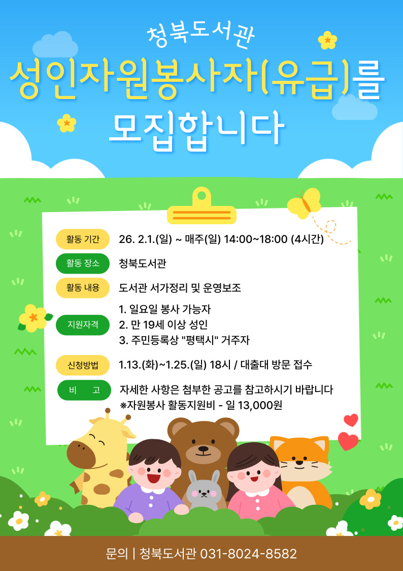 [청북] 주말 (유급)자원봉사자 모집 - 일요일 오후