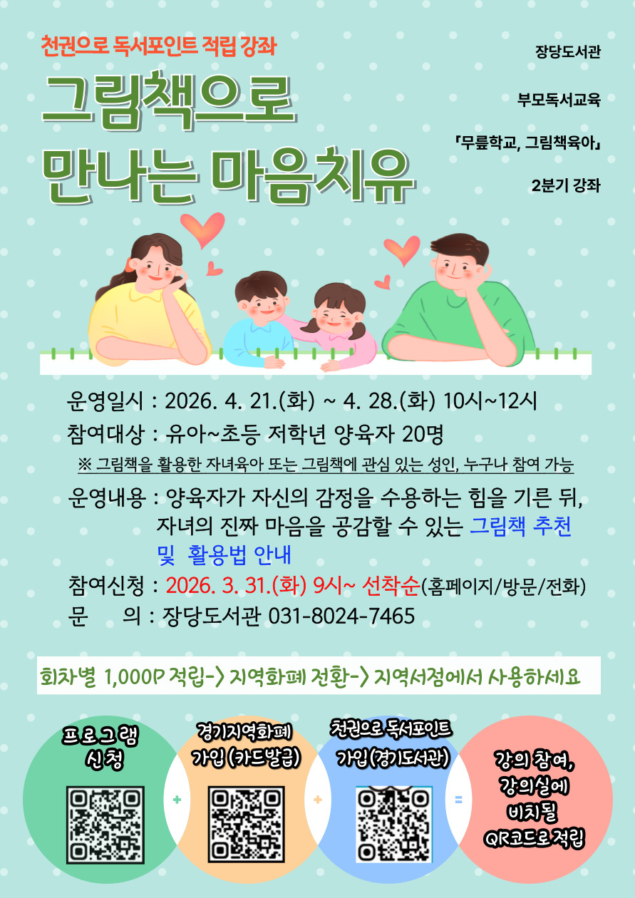 | 문화행사명 | [장당] 부모독서교육 <무릎학교, 그림책육아> 2분기 ※천권으로 독서포인트 적립 강좌※ |