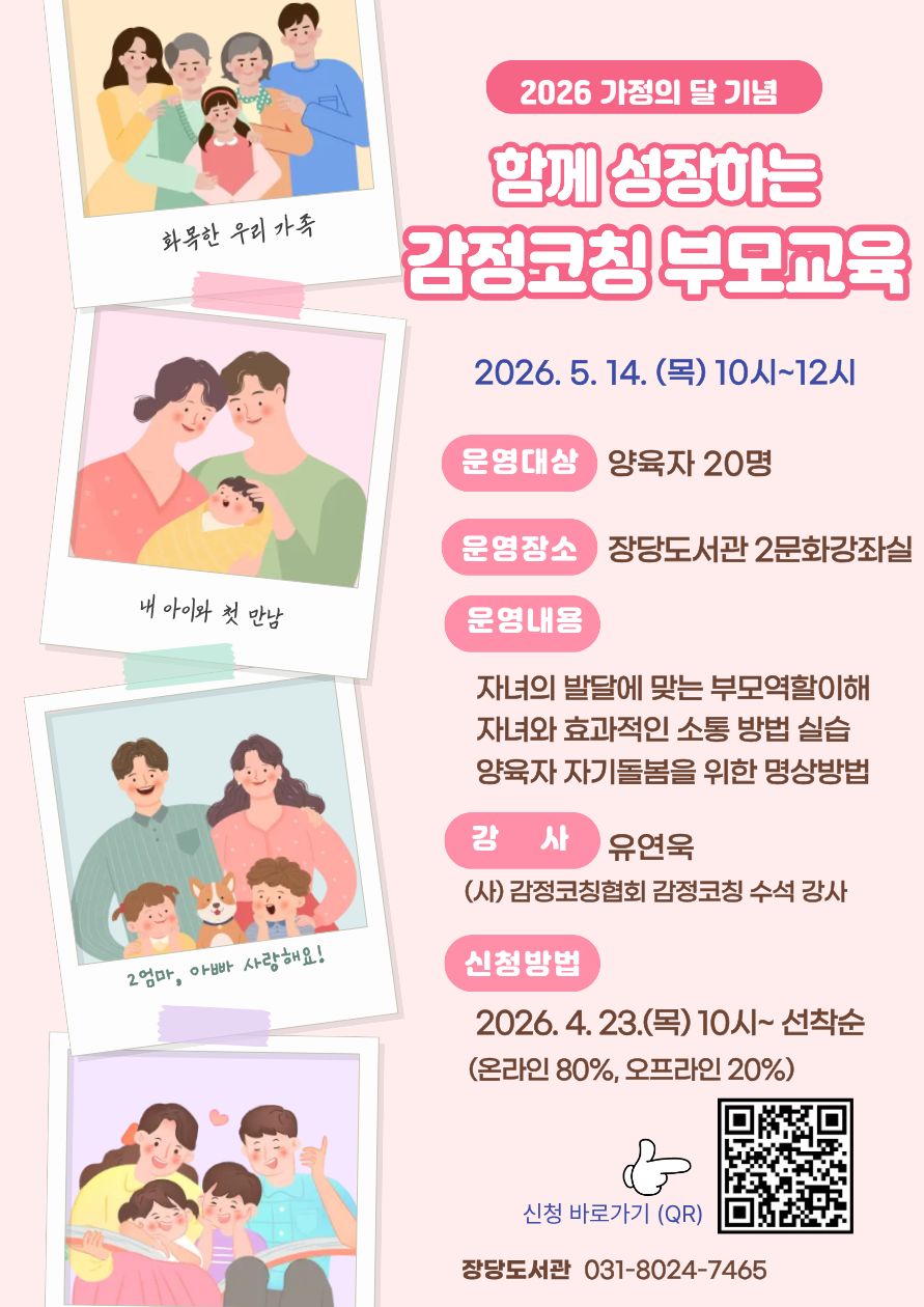 ※ 오프라인 (종합자료실 방문 또는 전화 031-8024-7465) 신청 (4명) 가능합니다. ※ 대기접수는 오프라인으로만 신청 가능합니다. ![]() 장당도서관 2026년 5월 가정의 달 기념 부모교육 특강입니다 *강의명 : 함께 성장하는 감정코칭 부모교육 *운영일 : 26. 5. 14.(목) 10시~12시 *대상 : 양육자 20명 *장소 : 2문화강좌실 *강사 : 유연욱 ※ 강의계획서는 첨부파일을 확인해주세요 |