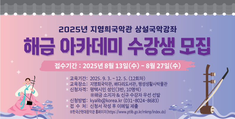 | 문화행사명 | 지영희국악관 「2025년 하반기 해금 아카데미」 수강생 모집 | ||||||||||||||||||