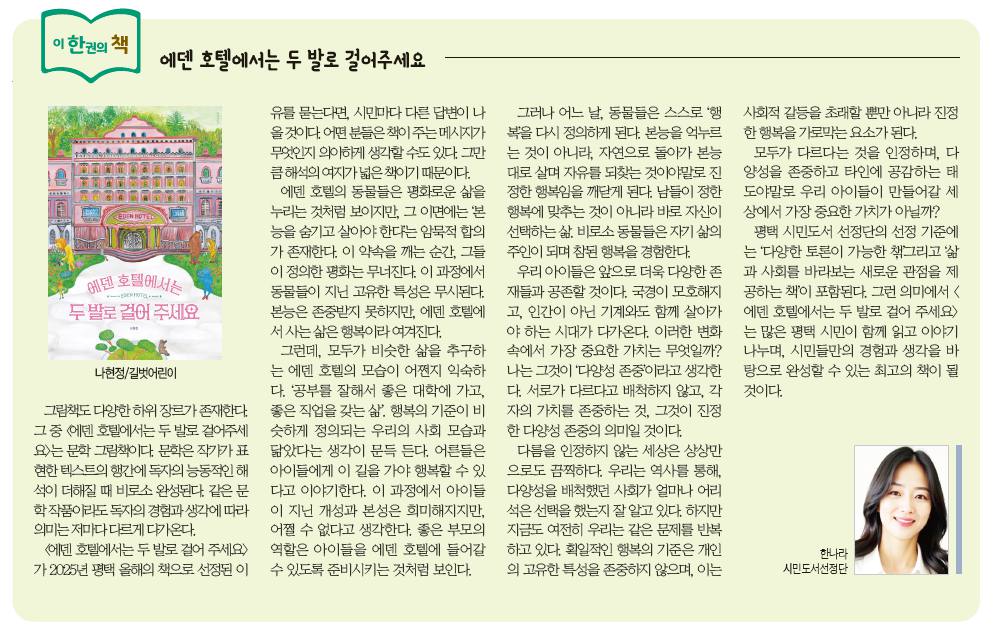 2025 독서칼럼 <에덴호텔에서는 두 발로 걸어주세요> (평택시사신문)