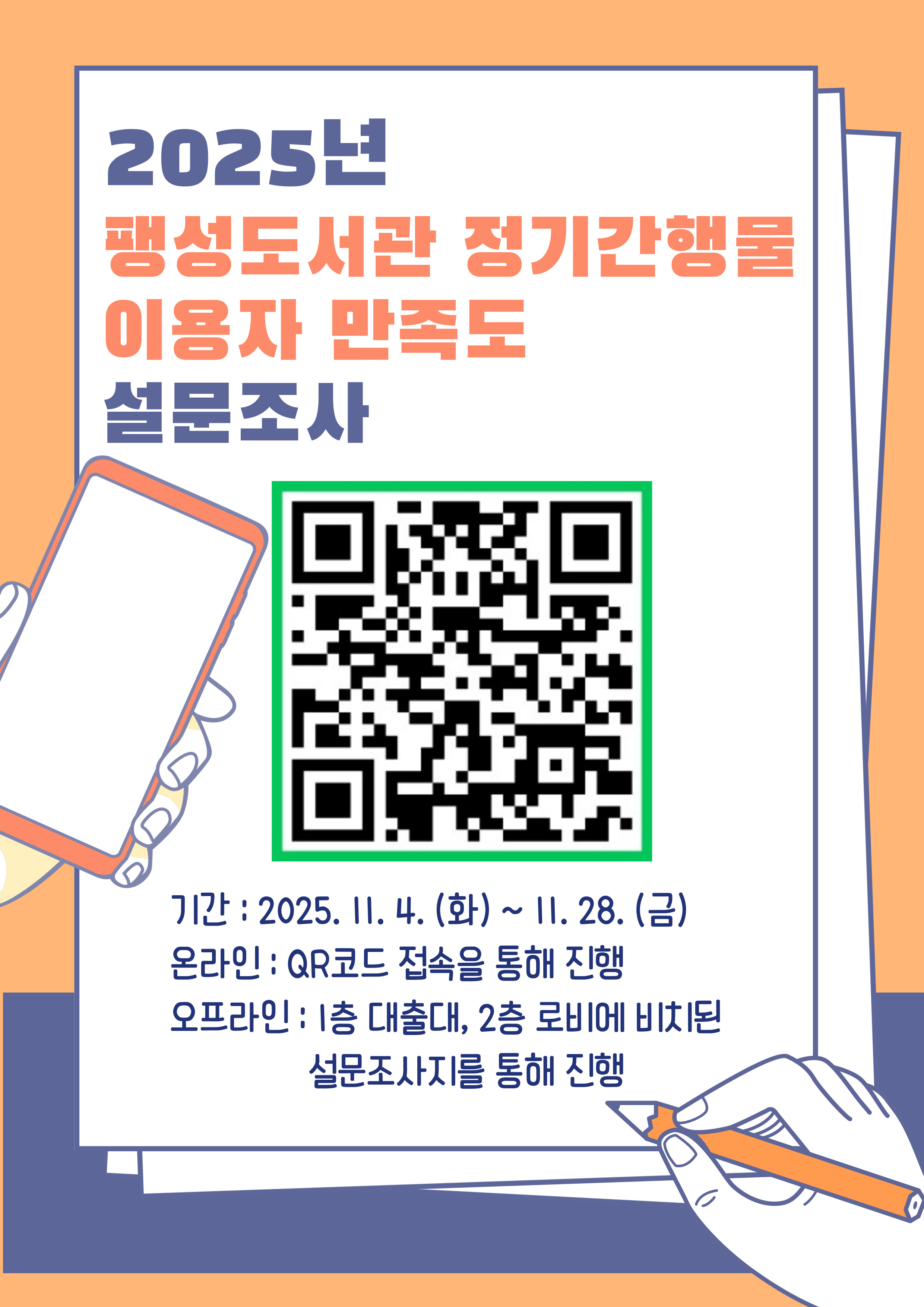 2025년 팽성도서관 정기간행물 이용자 만족도 조사 ☆조사기간 : 2025. 11. 4. (화) ~ 11. 28. (금) ☆조사내용 : 2025년 팽성도서관 정기간행물 이용자 만족도 조사 ☆조사방법 - 온라인 : QR코드를 통해 설문조사 진행 / 설문조사 폼 이동하기 - 오프라인 : 1층 대출대 또는 2층 로비 책상에 비치된 설문지 작성