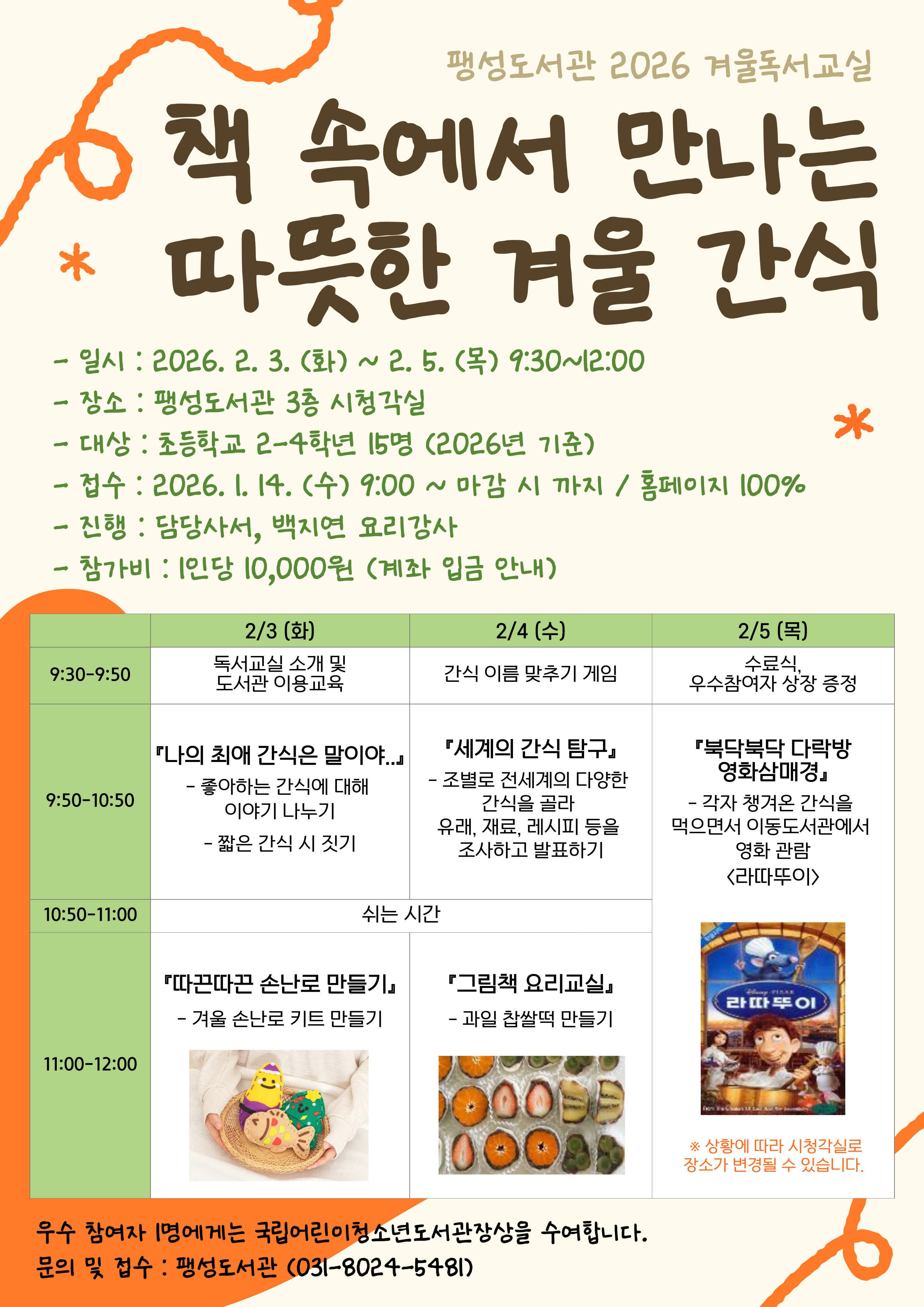 팽성도서관 2026년 겨울독서교실 <책 속에서 만나는 따뜻한 겨울 간식> *일시 : 2026. 2. 3. (화) ~ 2. 5. (목) 9:30~12:00 *장소 : 팽성도서관 3층 시청각실 *대상 : 초등학생 2~4학년 15명 (2026년 기준) *접수 : 2026. 1. 14. (수) 09:00~ 마감 시/ 홈페이지 100% *참가비 : 1인당 10,000원 (추후 계좌 입금 안내)