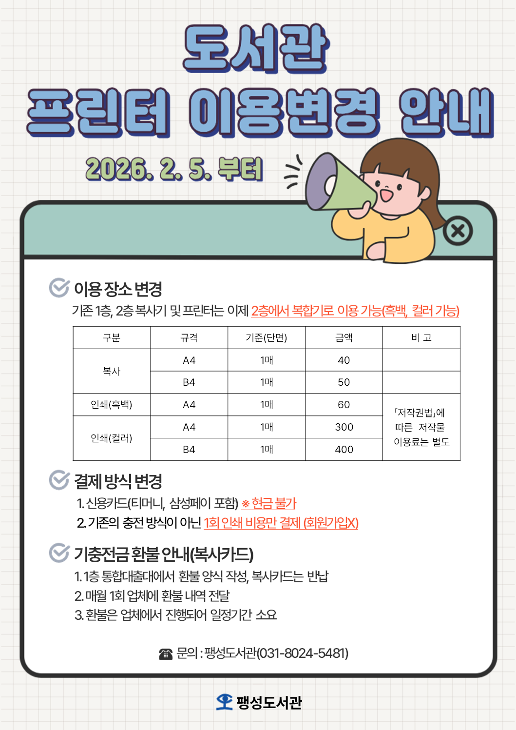 평택시도서관 복합기 교체로 인한 프린트 및 복사기(복사카드) 환불 안내