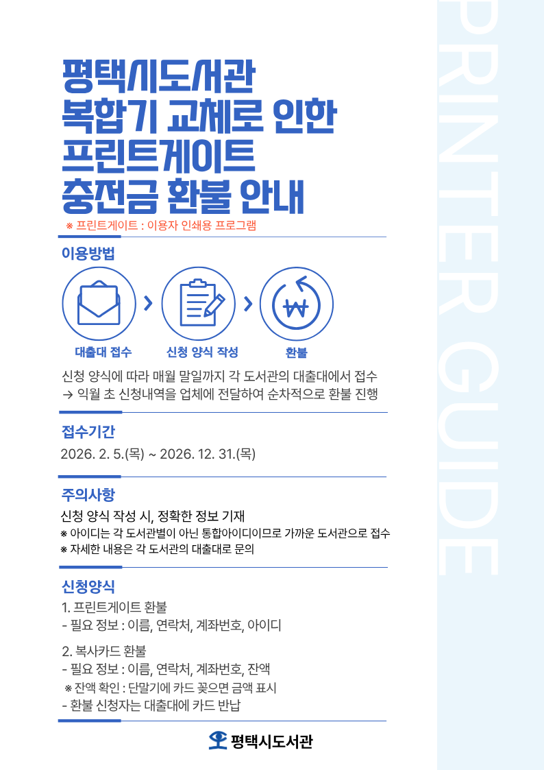 평택시도서관 복합기 교체로 인한 프린트 및 복사기(복사카드) 환불 안내