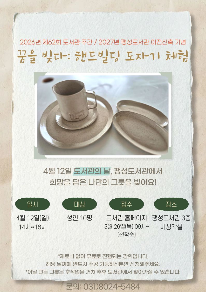 [4월 도서관주간] 꿈을 빚다: 핸드빌딩 도자기 체험 모집 안내