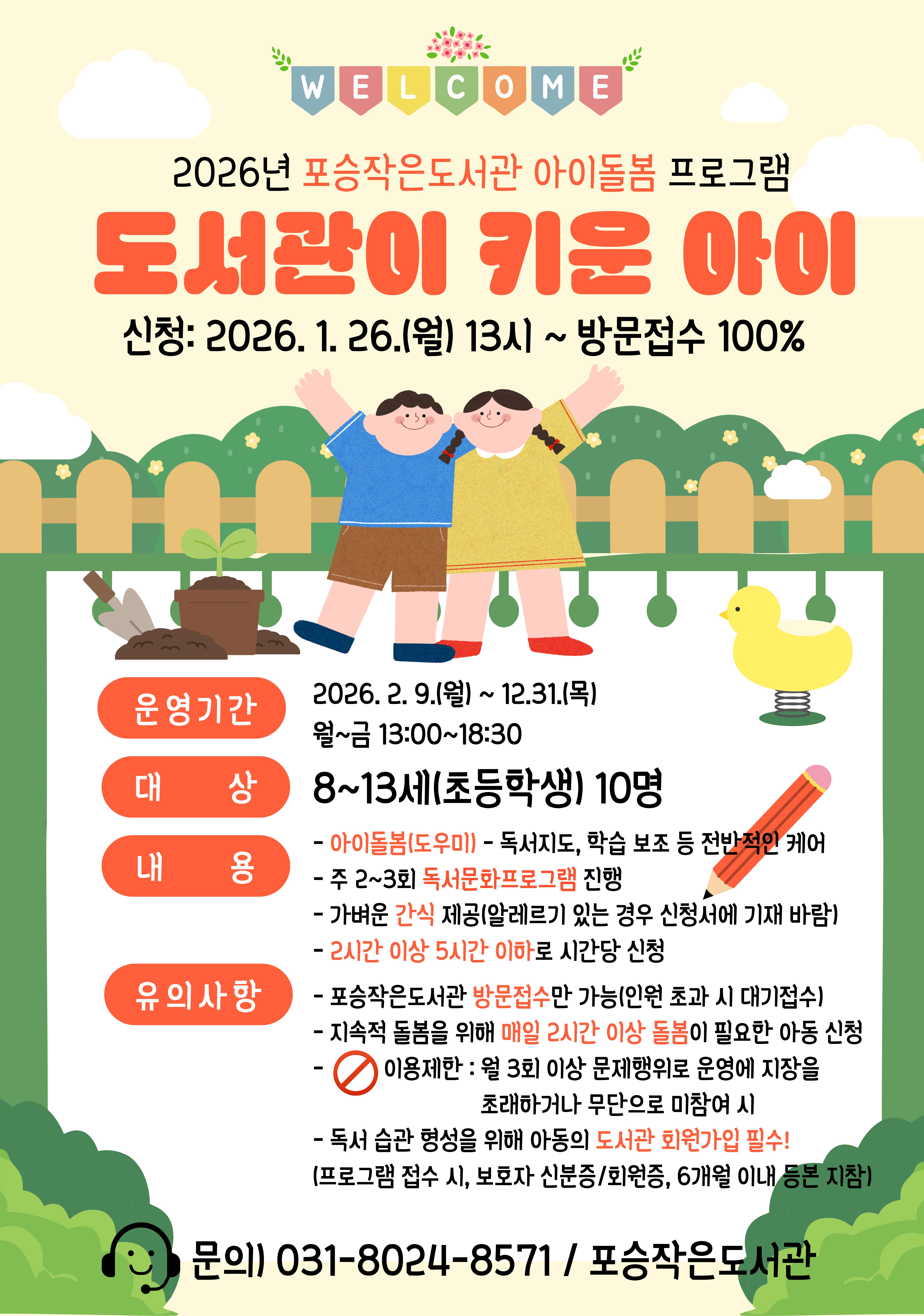 ![]() < 2026년 포승작은도서관 아이돌봄 프로그램- 도서관이 키운 아이 > *신청: 2026. 1. 26.(월) 13시~ 방문 접수 100% *기간: 2026. 2. 9.~12. 31. / 월~금 13:00~18:30 *대상: 8~13세(초등학생) 10명 *내용: 1. 아이돌봄(도우미) - 독서지도, 학습 보조 등 전반적인 케어 2. 주 2-3회 독서문화프로그램 진행 3. 가벼운 간식 제공(알레르기 있는 경우 신청서에 기재 바람) 4. 2시간 이상 5시간 이하로 시간당 신청 *유의사항: 참가신청서 양식 첨부파일 확인!! 1. 포승작은도서관 운영시간 중 방문 접수, 인원 초과 시 대기 접수 2. 지속적 돌봄을 위해 매일 2시간 이상 돌봄이 필요한 아동 신청 3. 이용 제한: 월 3회 이상 문제행위로 프로그램 운영에 지장을 초래하거나 무단으로 미참여 시 4. 독서습관 형성을 위해 아동의 도서관 회원가입 필수! (프로그램 접수 시 보호자 신분증/회원증, 6개월 이내 등본 지참) *문의)031-8024-8571 |