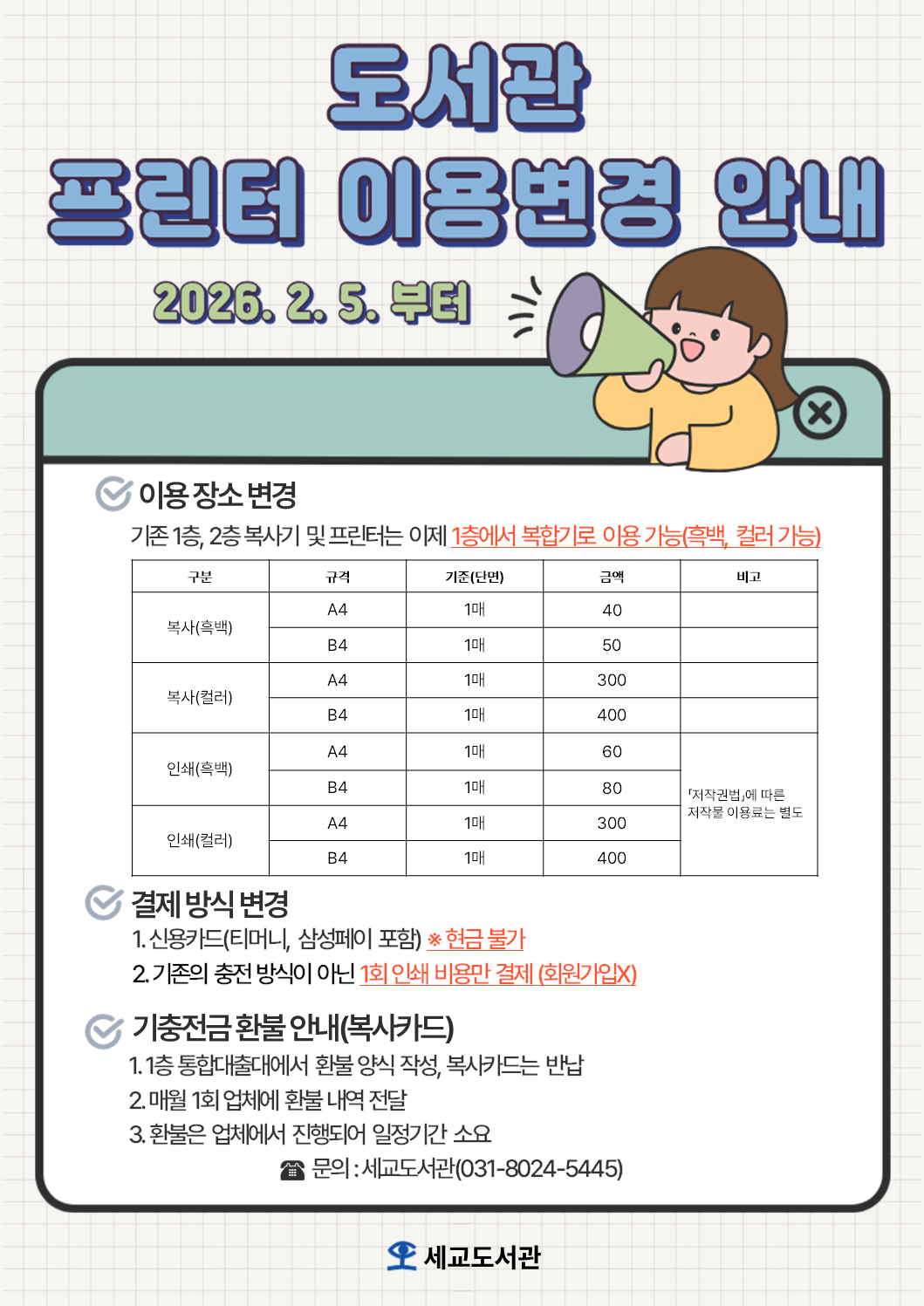 세교도서관 프린터 및 복사기 이용방법 변경 안내