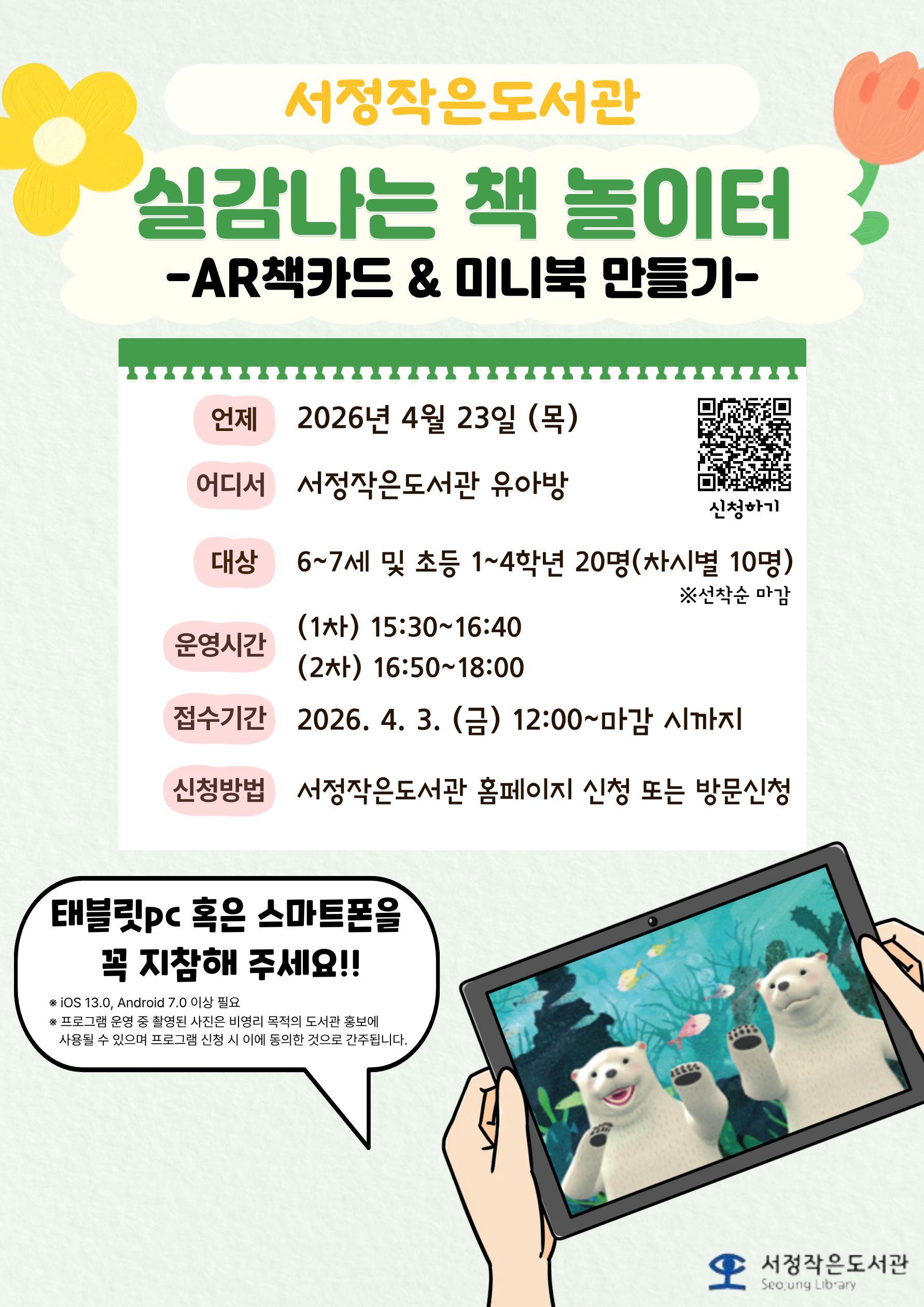 ![]() *일시: 26. 4. 23.(목) [1차 15:30~16:40] [2차 16:50~18:00] *대상: 6~7세 및 초등 1~4학년 20명(차시별 10명) *장소: 서정작은도서관 유아방 *내용: AR책카드&미니북 만들기 *접수: 상시접수중(※선착순 마감) - 온라인: 7명(*2개반) (1) 1차 문화행사/신청 : 평택시도서관 (2) 2차 문화행사/신청 : 평택시도서관 - 오프라인: 3명(*2개반) 선착순 방문접수 (서정작은도서관: 서정로 202, 1층) *문의: 서정작은도서관 전화(031-611-3764) *태블릿PC 또는 스마트폰 필수 지참 부탁드립니다. |
