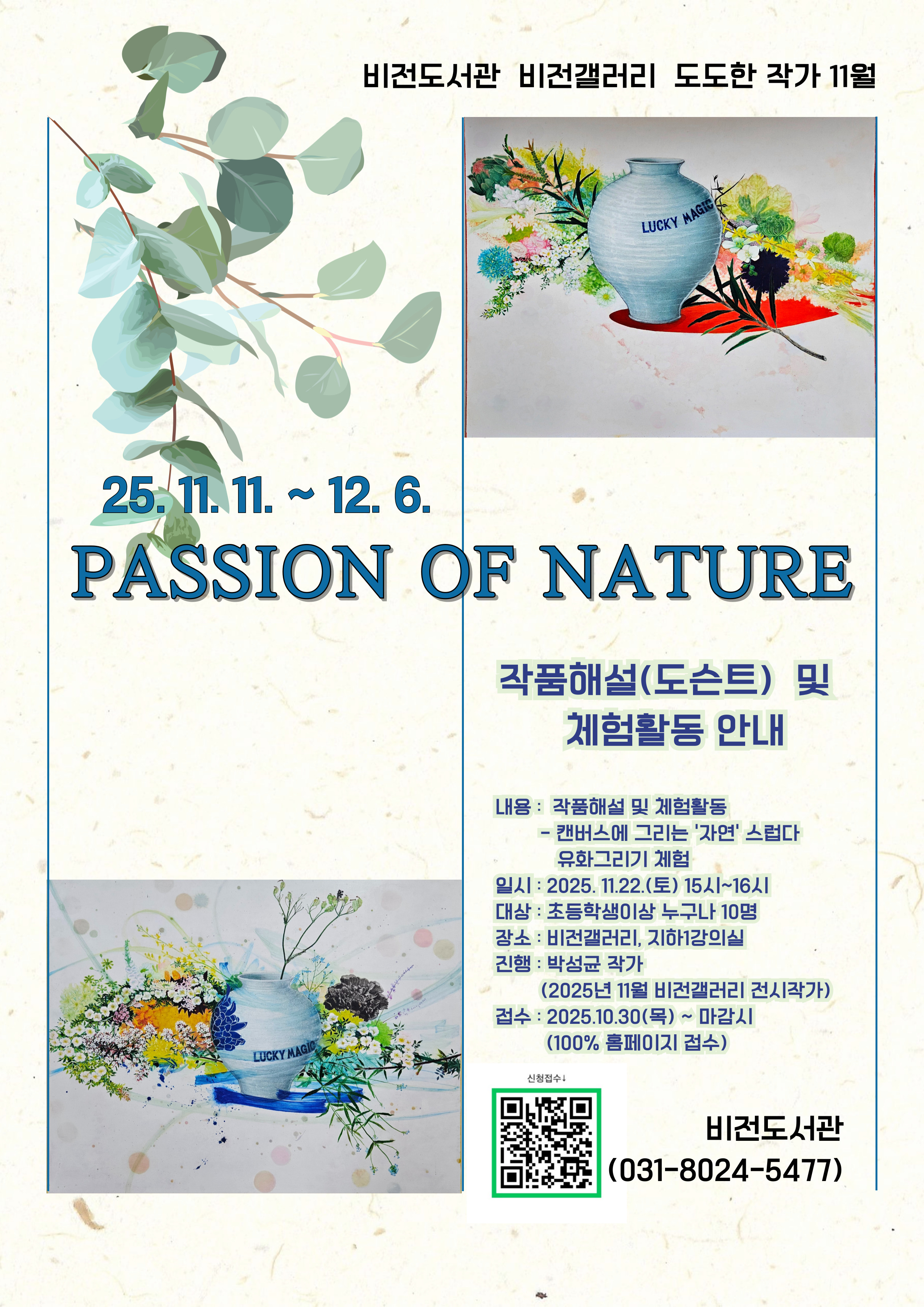 ![]() 비전도서관 비전갤러리 도도한 작가 11월 25.11.11.~12.6. PASSION OF NATURE 작품해설(도슨트) 및 체험활동 안내 내용: 작품해설 및 체험활동 -캔버스에 그리는 '자연'스럽다 유화그리기 체험 일시: 2025.11.22 (토) 15시~16시 대상: 초등학생이상 누구나 10명 장소: 비전갤러리, 지하1강의실 진행: 박성균 작가(2025년 11월 비전갤러리 전시작가) 접수: 2025.10.30(목)~ 마감시 (100% 홈페이지 접수) 비전도서관(031-8024-5477) |