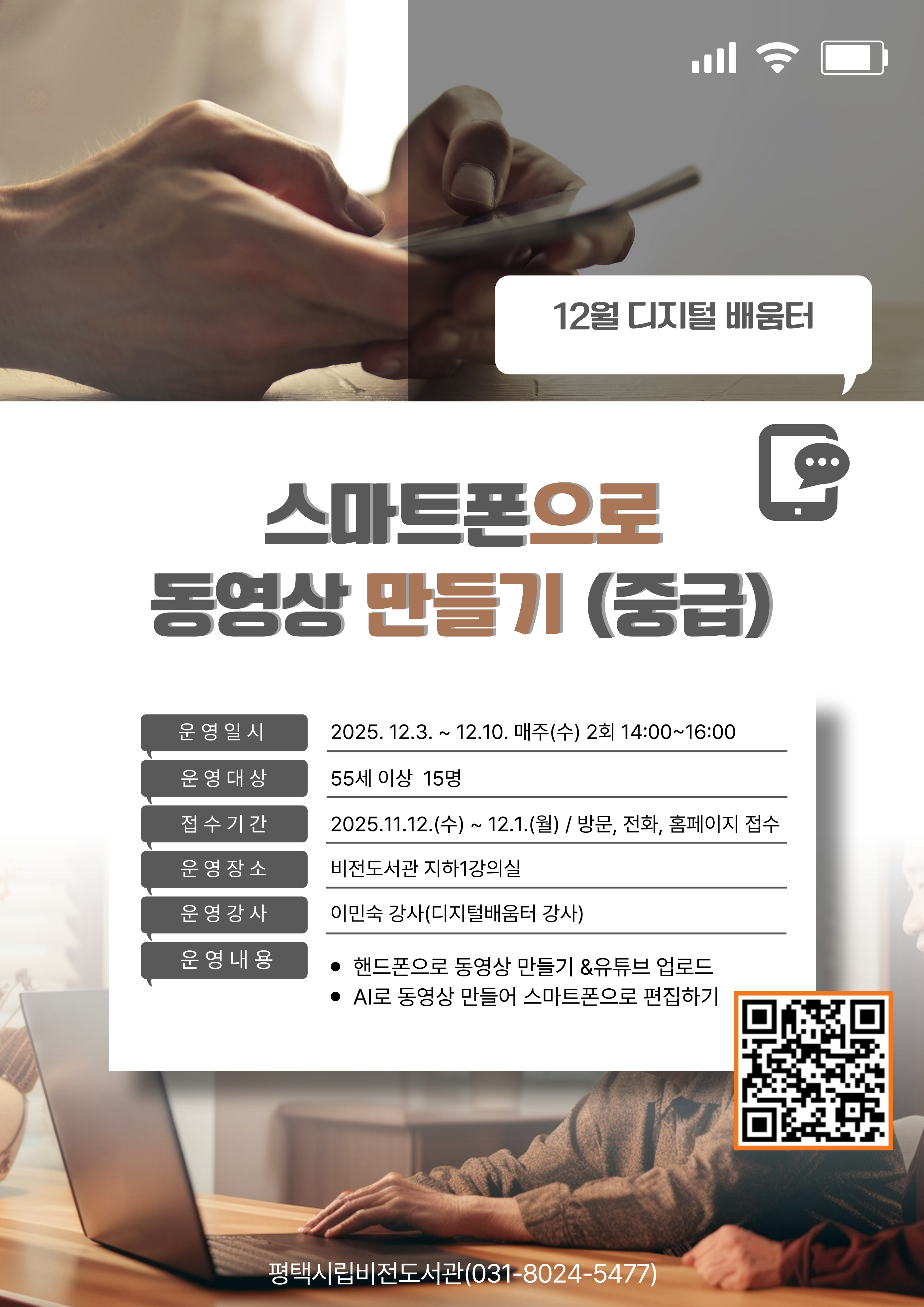 | [디지털배움터] 12월 디지털배움터 <스마트폰으로 동영상 만들기(중급)> 운영안내 | |