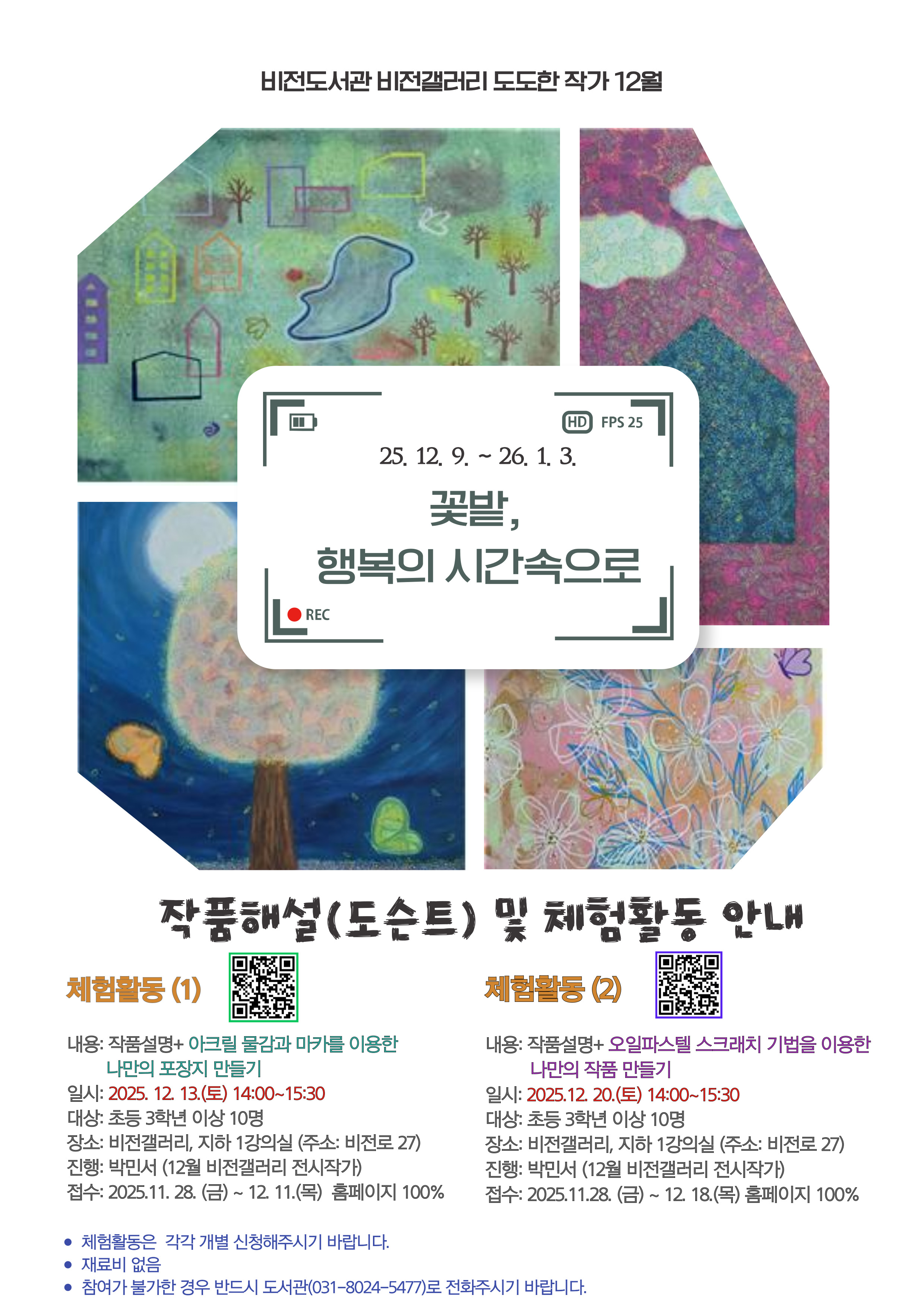 ![]() 비전도서관 비전갤러리 도도한 작가 12월 꽃밭, 행복의 시간속으로 체험활동1 내용: 작품설명+아크릴 물감과 마카를 이용한 나만의 포장지 만들기 일시: 2025.12.13.(토) 14:00~15:30 대상: 초등3학년 이상 10명 장소: 비전갤러리, 지하 1강의실(비전로 27) 진행: 박민서(12월 비전갤러리 전시작가) 접수: 2025.11.28(금)~12.11.(목) 홈페이지 100% 체험활동2 내용: 작품설명+오일 파스텔 스크래치 기법을 이용한 나만의 작품 만들기 일시: 2025.12.20.(토) 14:00~15:30 대상: 초등3학년 이상 10명 장소: 비전갤러리, 지하 1강의실(비전로 27) 진행: 박민서(12월 비전갤러리 전시작가) 접수: 2025.11.28(금)~12.18(목) 홈페이지 100% *체험활동은 각각 개별 신청해 주시기 바랍니다. *재료비 없음 *참여가 불가한 경우 반드시 도서관(031-8024-5477)로 전화주시기 바랍니다. |