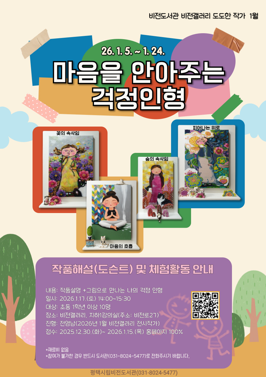 ![]() 마음을 안아주는 걱정인형 (26.1.5.~1.24.) 작품해설(도슨트) 및 체험활동 안내 내용: 작품설명 + 그림으로 만나는 나의 걱정인형 일시: 2026.1.17.(토) 14:00~15:30 대상: 초등 1학년 이상 10명 장소: 비전갤러리, 지하1강의실(주소:비전로 27) 진행: 전영남(2026년 1월 비전갤러리 전시작가) 접수: 2025.12.30.(화)~2026.1.15.(목) 홈페이지 100% 재료비 없음/ 참여가 불가한 경우 반드시 도서관(031-8024-5477)로 전화주시기 바랍니다. 평택시립비전도서관(031-8024-5477) |