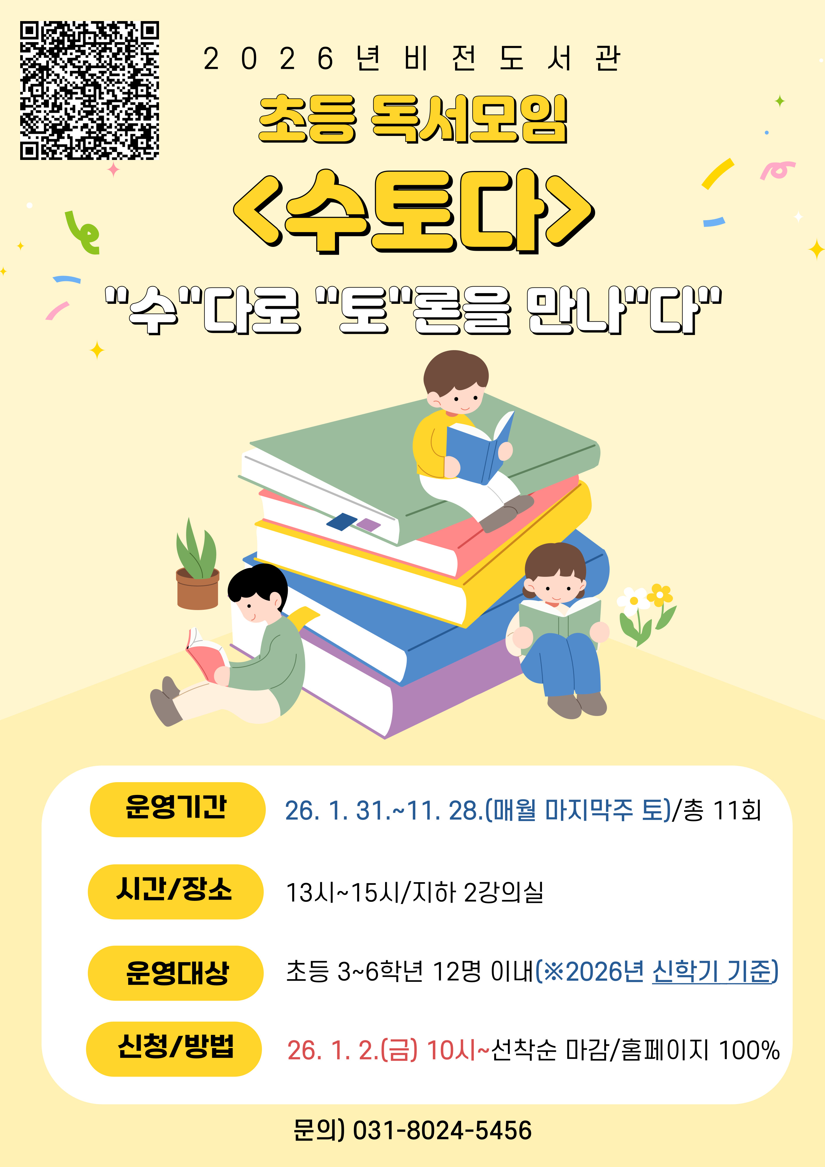 <2026년 비전도서관 초등 독서모임-수토다> "수"다로 "토"론을 만나"다" *운영기간: 26. 1. 31.~11. 28.(매월 마지막주 토)/총 11회 *시간/장소: 13~15시/지하 2강의실 *운영대상: 초등3~6학년 12명 이내(※2026년 신학기 기준) *신청/방법: 26. 1. 2.(금) 10시~선착순 마감/홈페이지 100% 문의) 031-8024-5456