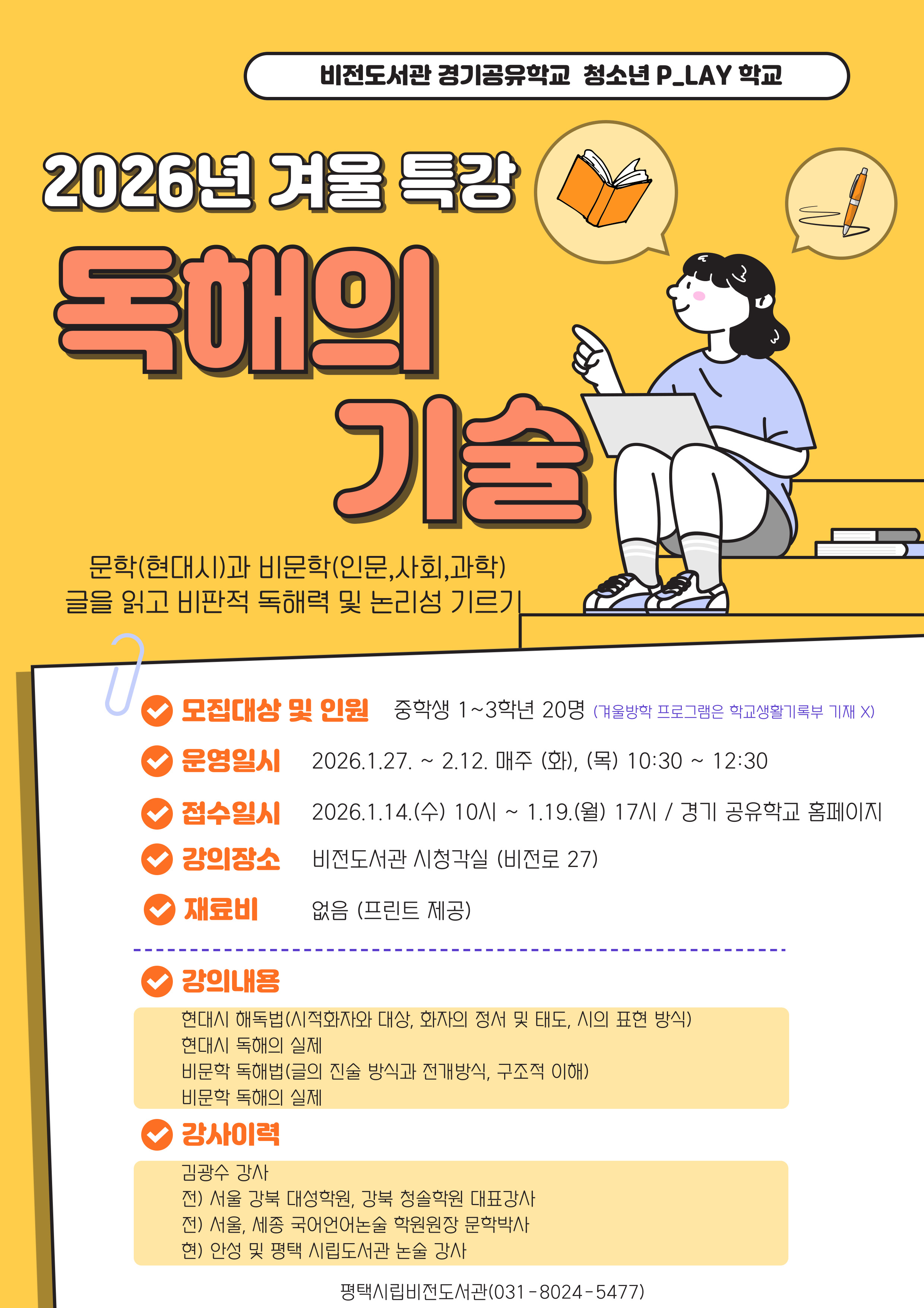 ![]() 비저도서관 경기공유학교 청소년 P_LAY 학교 2026년 겨울 특강 <독해의 기술> 문학(현대시)와 비문학(인문,사회,과학) 글을 읽고 비판적 독해력 및 논리성 기르기 -모집대상 및 인원: 중학생 1~3학년 20명 (겨울방학 프로그램은 학교생활기록부 기재 안됨) -운영일시: 2026.1.27~2.12 매주 (화),(목) 10:30~12:30 6회 -접수일시: 2026.1.14(수) 10시 ~1.19(월) 17시 / 경기 공유학교 홈페이지 -강의장소: 비전도서관 3층 시청각실 -재료비: 없음 -강의내용: 현대시 해독법(시적화자와 대상, 화자의 정서 및 태도, 시의 표현 방식), 현대시 독해의 실제, 비문학 독해법(글의 진술 방식과 전개방식, 구조적 이해), 비문학 독해의 실제 -강사이력: 김광수 강사 (전) 서울 강북 대성학원, 강북 청솔학원 대표강사, 전)서울, 세종 국어언어논술 학원 원장 문학박사, 현)안성 및 평택 시립도서관 논술 강사) 문의 평택시립비전도서관(031-8024-5477) |