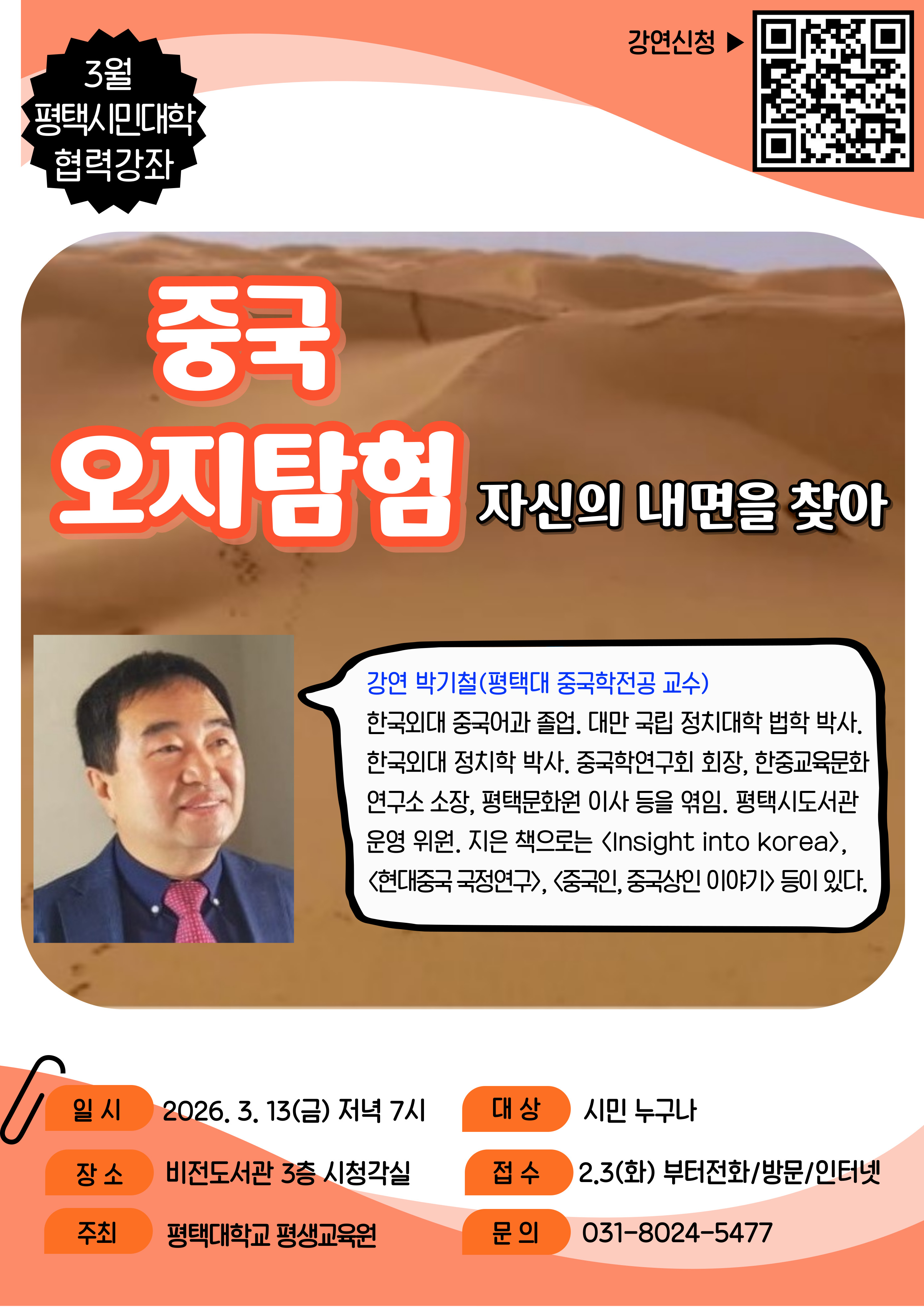 비전도서관 3월 평택시민대학 협력강좌 "중국 오지탐험 - 자신의 내면을 찾아" 신청접수 바로가기 클릭>>>> 프로그램참여신청 : 비전도서관(★접수 2.3(화)부터) ○일시: 26. 3. 13.(금) 19시~21시 ○장소: 비전도서관 3층 시청각실 ○대상: 시민누구나 60명 ○강사: 박기철(평택대 교수) ○문의: 031-8024-5477 ○주최: 평택대학교 평생교육원