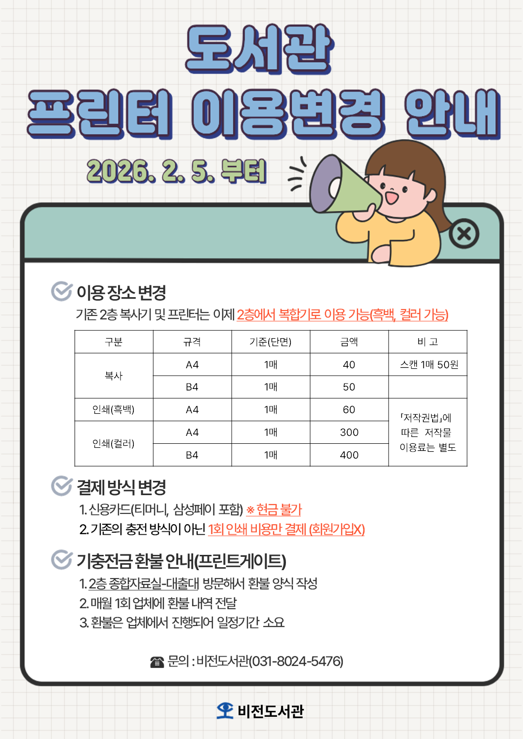 ※프린트게이트 환불은 비전도서관 2층 종합자료실에서 접수