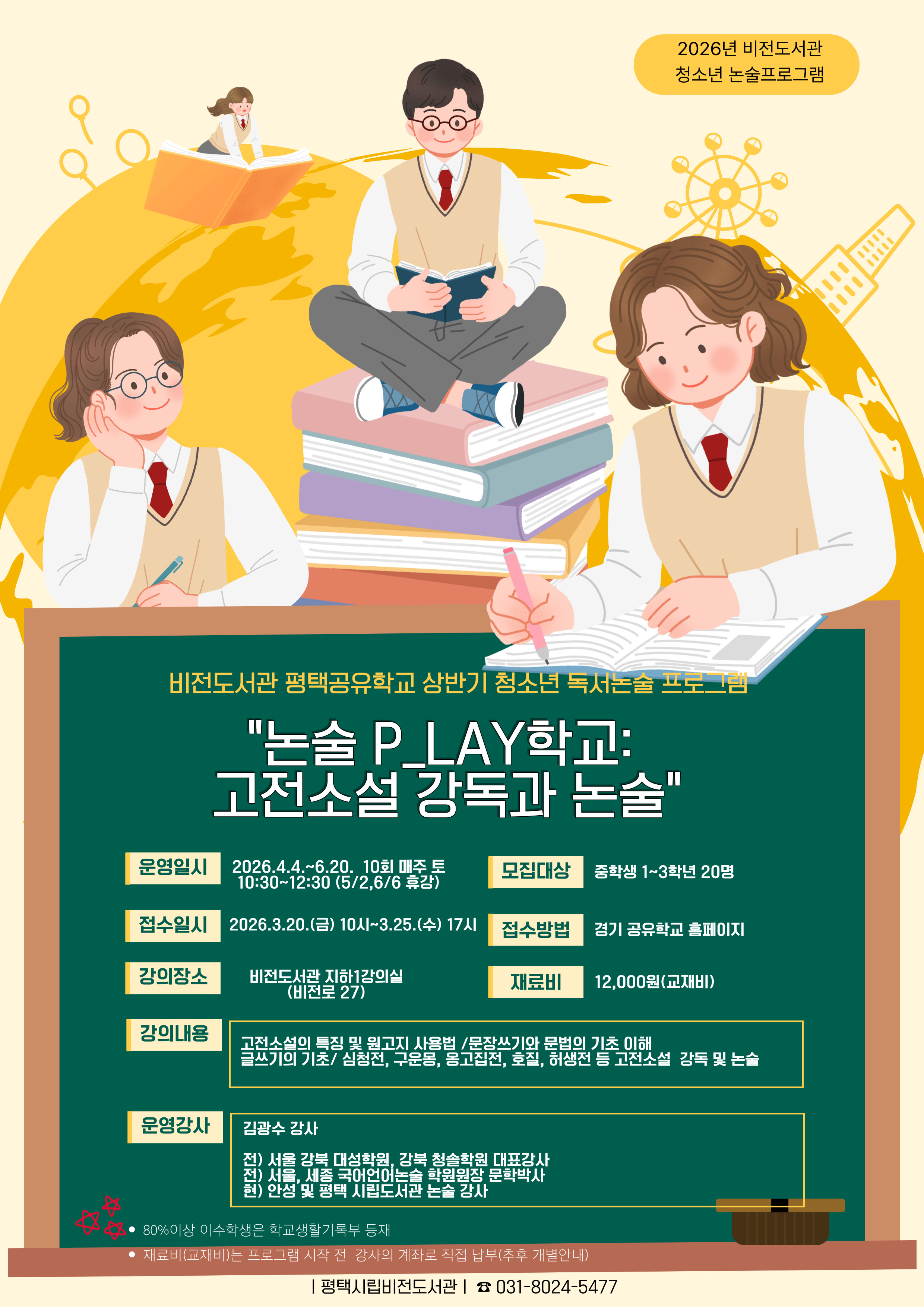 ![]() 2026년 비전도서관 청소년 논술프로그램 평택공유학교 상반기 청소년 독서논술 프로그램 논술P_LAY학교: 고전소설 강독과 논술 -운영일시: 2026.4.4.~6.20. 10회 매주 토 10:30~12:30 (5.2, 6.6 휴강) -모집대상: 중학생 1~3학년 20명 -접수일시: 2026.3.20.(금) 10시~3.25.(수) 17시 -접수방법: 경기 공유학교 홈페이지 -강의장소: 비전도서관 지하1강의실(비전로 27) -재료비: 12,000원(교재비) -강의내용: 고전소설의 특징 및 원고지 사용법/ 문장쓰기와 문법의 기초 이해/ 글쓰기의 기초/ 심청전, 구운몽, 옹고집전, 호질, 허생전 등 고전소설 강독 및 논술 -운영강사: 김광수 강사 전)서울 강북 대성학원, 강북 청솔학원 대표강사 전)서울, 세종 국어언어논술 학원원장 문학박사 현)안성 및 평택 시립도서관 논술 강사 *80%이상 이수학생은 학교생활기록부 등재 *재료비(교재비)는 프로그램 시작 전 강사의 계좌로 직접 납부(추후 개별 안내) |