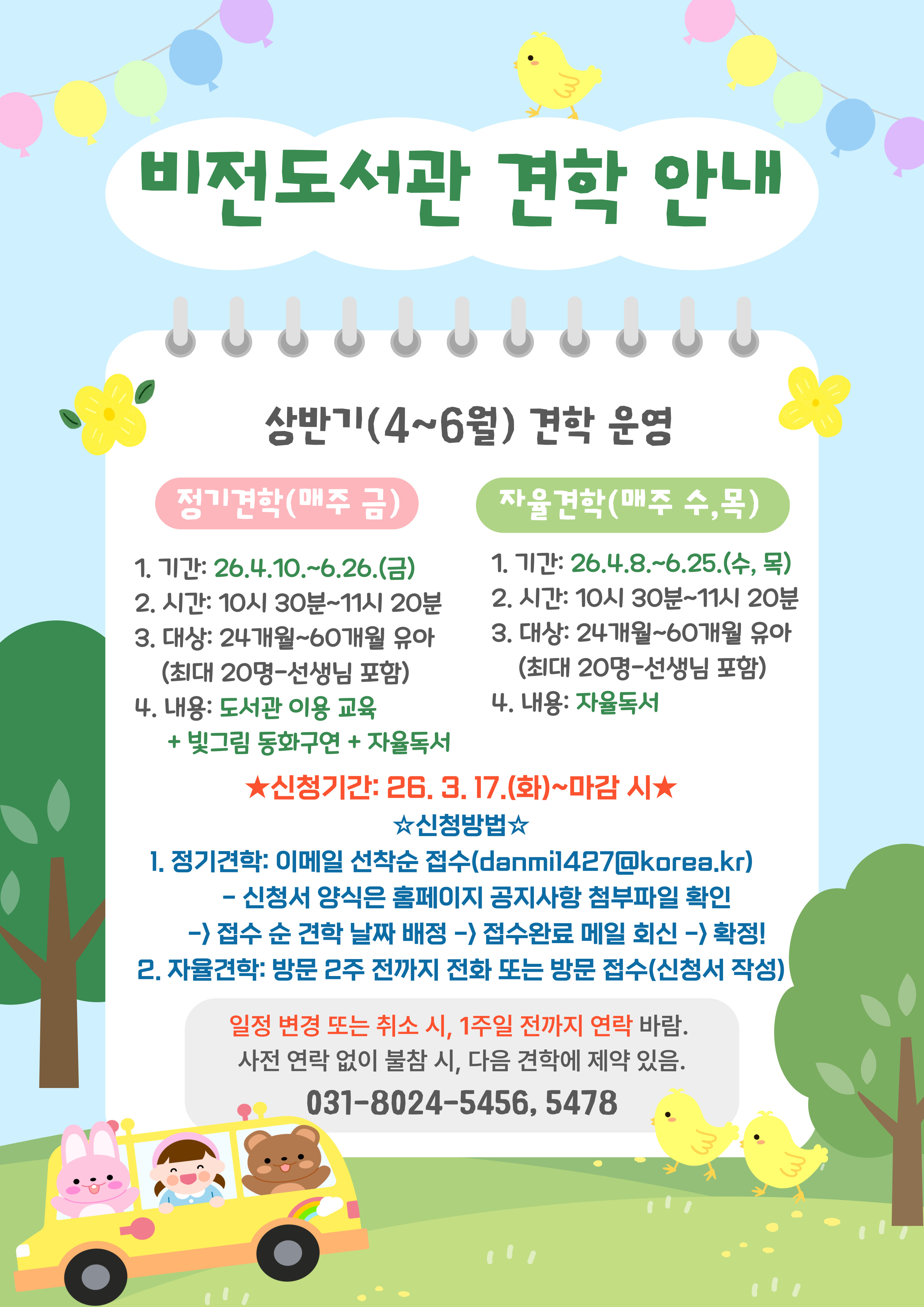 <비전도서관 견학 안내-상반기(4~6월) 견학 운영> *정기견학(매주 금) 1. 기간: 26.4.10.~6.26.(금) / ※5.1.은 제외(미운영) 2. 시간: 10시 30분~11시 20분 3. 대상: 24개월~60개월 유아(최대 20명-선생님 포함) 4. 내용: 도서관 이용 교육 + 빛그림 동화구연 + 자율독서 *자율견학(매주 수, 목) 1. 기간: 26.4.8.~6.25.(수, 목) 2. 시간: 10시 30분~11시 20분 3. 대상: 24개월~60개월 유아(최대 20명-선생님 포함) 4. 내용: 자율독서 *신청기간: 26.3.17.(화)~마감 시 *신청방법 1. 정기견학: 이메일 선착순 접수(danmi1427@korea.kr) -신청서 양식은 홈페이지 공지사항 첨부파일 확인 -> 접수 순 견학 날짜 배정 -> 접수완료 메일 회신 -> 확정! 2. 자율견학: 방문 2주 전까지 전화 또는 방문 접수(신청서 작성) *일정 변경 또는 취소 시, 1주일 전까지 연락 바람. -사전 연락 없이 불참 시, 다음 견학에 제약 있음. *031-8024-5456, 5478
