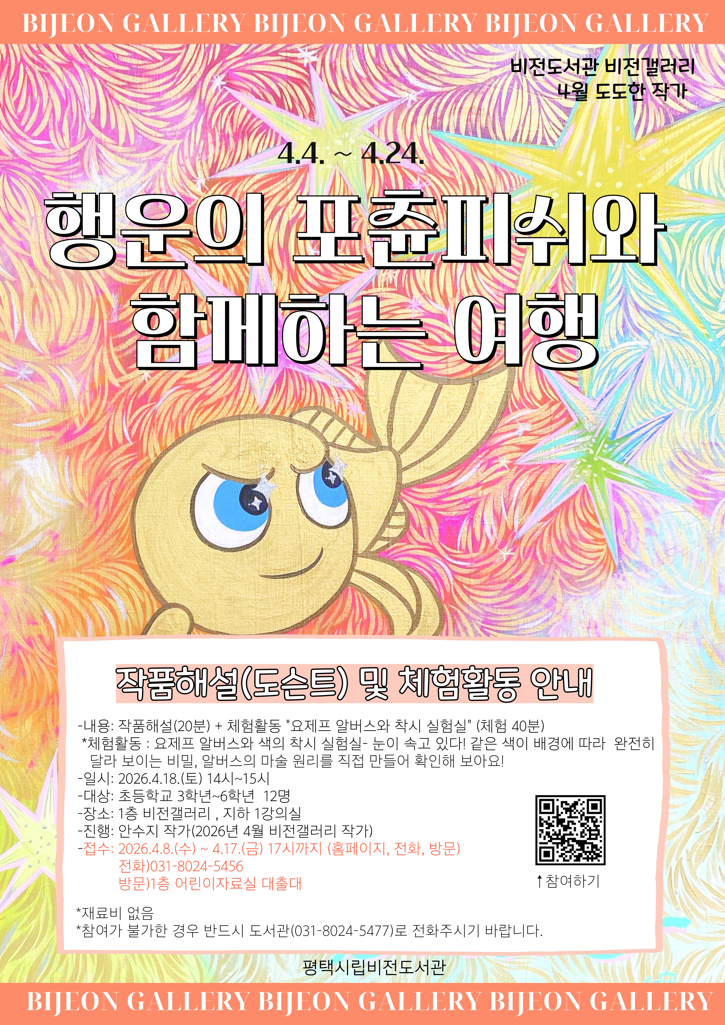 비전도서관 비전갤러리 4월 도도한 작가 4.4.~4.24. <행운의 포츈피쉬와 함께하는 여행> 작품해설(도슨트) 및 체험활동 안내 -내용: 작품해설(20분)+체험활동 "요제프 알버스와 착시 실험실"(체험 40분) *체험활동: 요제프 알버스와 색의 착시 실험실-눈이 속고 있다! 같은 색이 배경에 따라 완전히 달라 보이는 비밀, 알버스의 마술 원리를 직접 만들어 확인해 보아요! -일시: 2026.4.18.(토) 14~15시 -대상: 초등학교 3~6학년 12명 -장소: 1층 비전갤러리, 지하1강의실 -진행: 안수지 작가(2026년 4월 비전갤러리 작가) -접수: 2026.4.8.(수)~4.17.(금) 17시까지 (홈페이지, 전화, 방문) 전화) 031-8024-5456 방문) 1층 어린이자료실 대출대 ![]() *재료비 없음 *참여가 불가한 경우 반드시 도서관(031-8024-5477)로 전화주시기 바랍니다. |